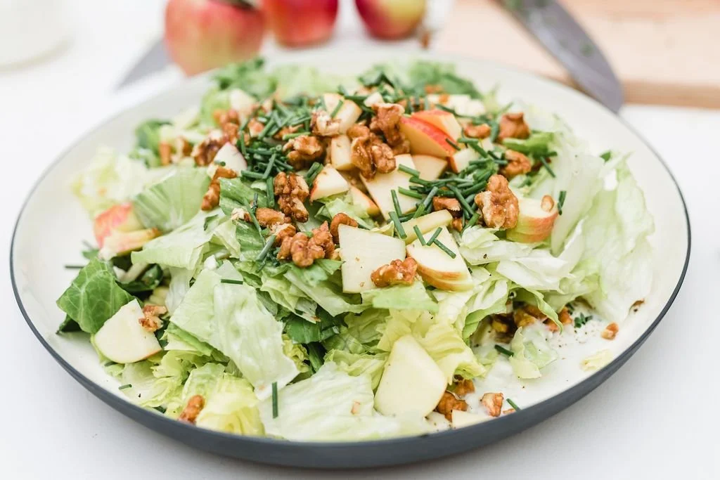 A garlic and dill dressing brings out the best in a nutritious melange of fresh veggies. Thin slices of sweet apple add an irresistible flavor contrast to the medley.