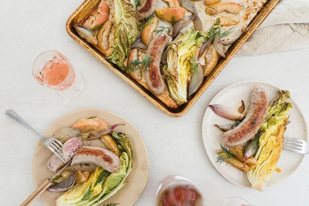 Add quartered napa heart and bratwurst sausages to the sheet pan, drizzle with more olive oil, and cook for another 20 to 25 minutes.