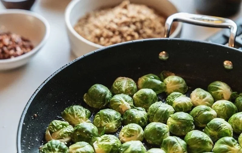 In a cast-iron skillet, cook onions, garlic, Brussels sprouts, napa cabbage, and broccoli in melted butter.