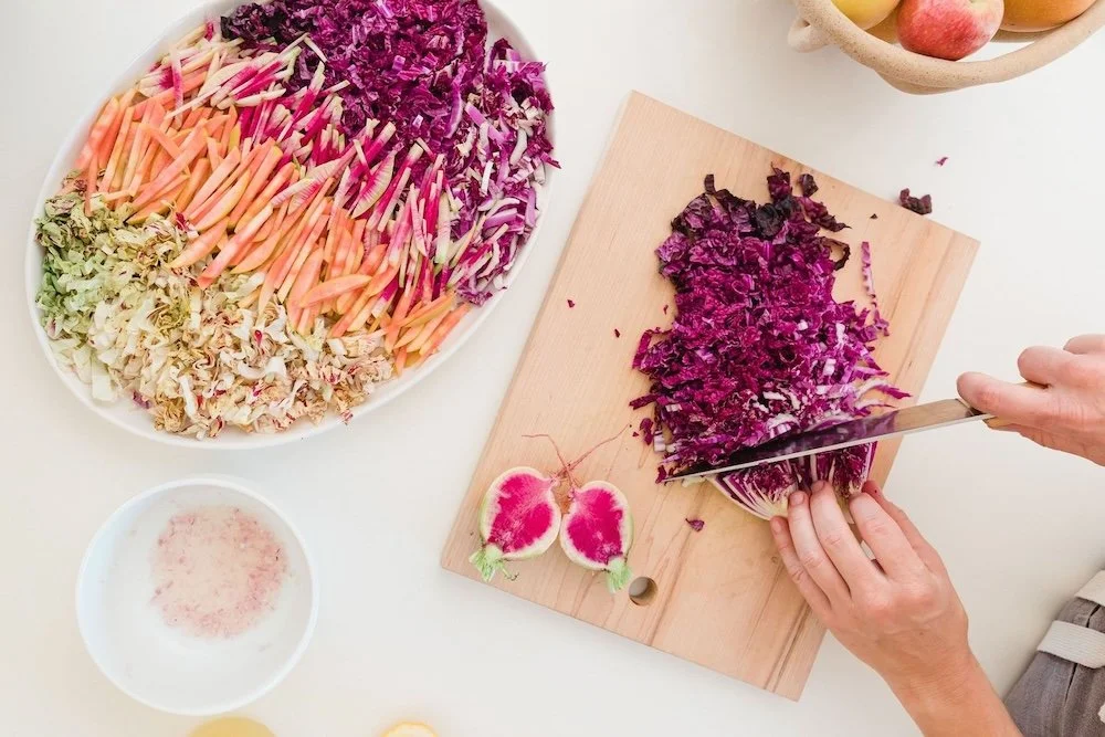 Chop the napa cabbage, radicchio, apple, and radish, then toss the veggie mixture with the vinaigrette.