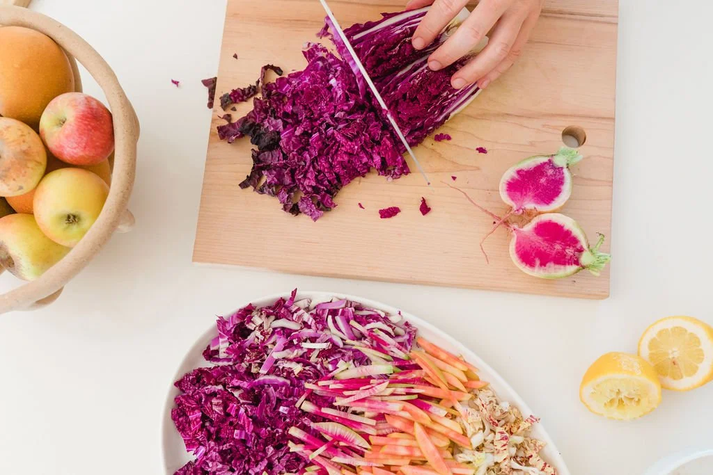 Quarter the purple napa cabbage and radicchio lengthwise through the core. Discard the tough core, then slice crosswise. Combine with apple and radish, and toss with vinaigrette. Shave generous amounts of parmesan cheese over finished salad and sprinkle with finishing salt.